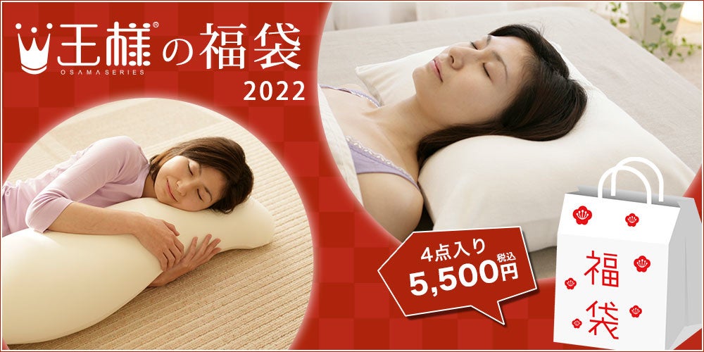 「王様の福袋 2022」は、王様シリーズの中でも人気が高い「王様の夢枕」と「王様の抱き枕」の福袋限定仕様バージョンを含む4点セット。総額およそ17,000円相当の豪華なセットが、「王様の夢枕」(通常価格 税込6,600円)1点の価格よりもお得な、5,500円(税込)でご購入いただくことができる福袋となっております。