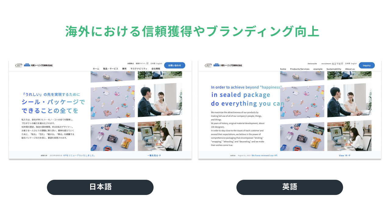現在は世界中に販売・製造拠点を構え、国内だけでなく海外での売上拡大にも注力しています。海外における信頼獲得やブランディング向上には、コーポレートサイトのコンテンツ充実化と多言語対応が欠かせません。加えて、大阪シーリング印刷のコーポレートサイトは、潜在・既存顧客が大阪シーリング印刷の企業理解を深め、製品情報を詳しく知るために重要な“マーケティングツール”の役割を担っており、より多くの情報をスピーディに英語で届ける必要がありました。