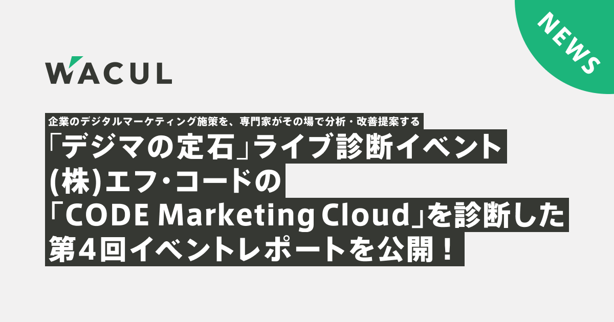 データ分析ツール「AI アナリスト」でマーケティングDX を自動化する株式会社WACUL(読み:ワカル、代表取締役社長:大淵 亮平、以下当社)は、企業のデジタルマーケティング施策をその場で専門家が診断し、リアルタイムに課題や改善点をアドバイスする「デジマの定石」ライブ診断イベントの第4回を2022年10月25日(火)、27日(木)に開催いたしました。ゲストに迎えた株式会社エフ・コード様のデジタルマーケティング施策を診断したイベントレポートを公開しましたのでお知らせします。