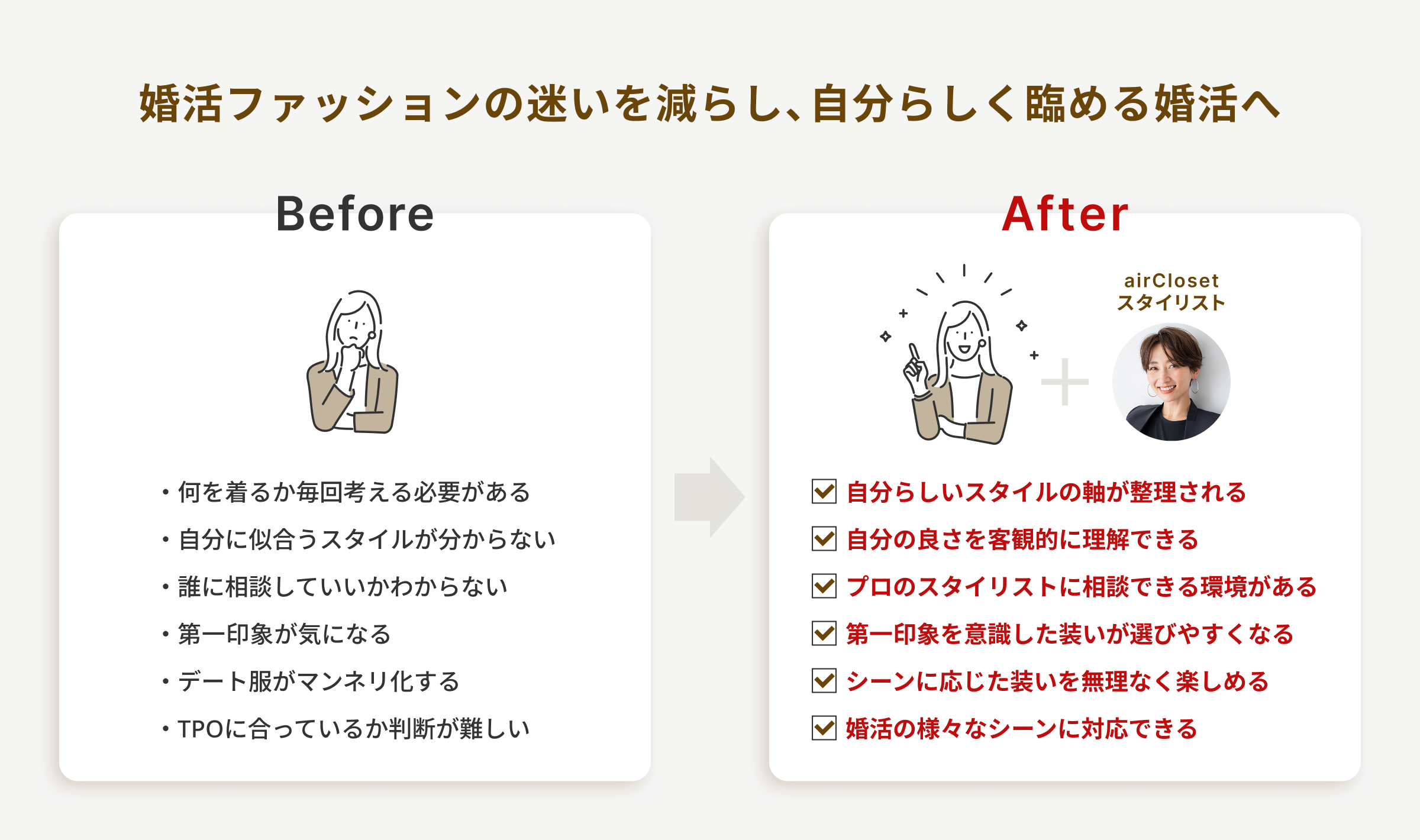 本協業では、初対面の場における第一印象づくりにとどまらず、お見合い後のデートや関係性が深まっていく過程においても、その人らしい好印象が自然に伝わるスタイリングを支援します。『airCloset』によるオンラインでの継続的なスタイリング支援と、実店舗『airCloset Salon』での対面診断を組み合わせることで、利用を重ねるほどに「似合う」の軸が明確になる仕組みを構築します。婚活という人生の節目において、自分らしさを大切にしながら前向きに一歩を踏み出せる体験を提供してまいります。