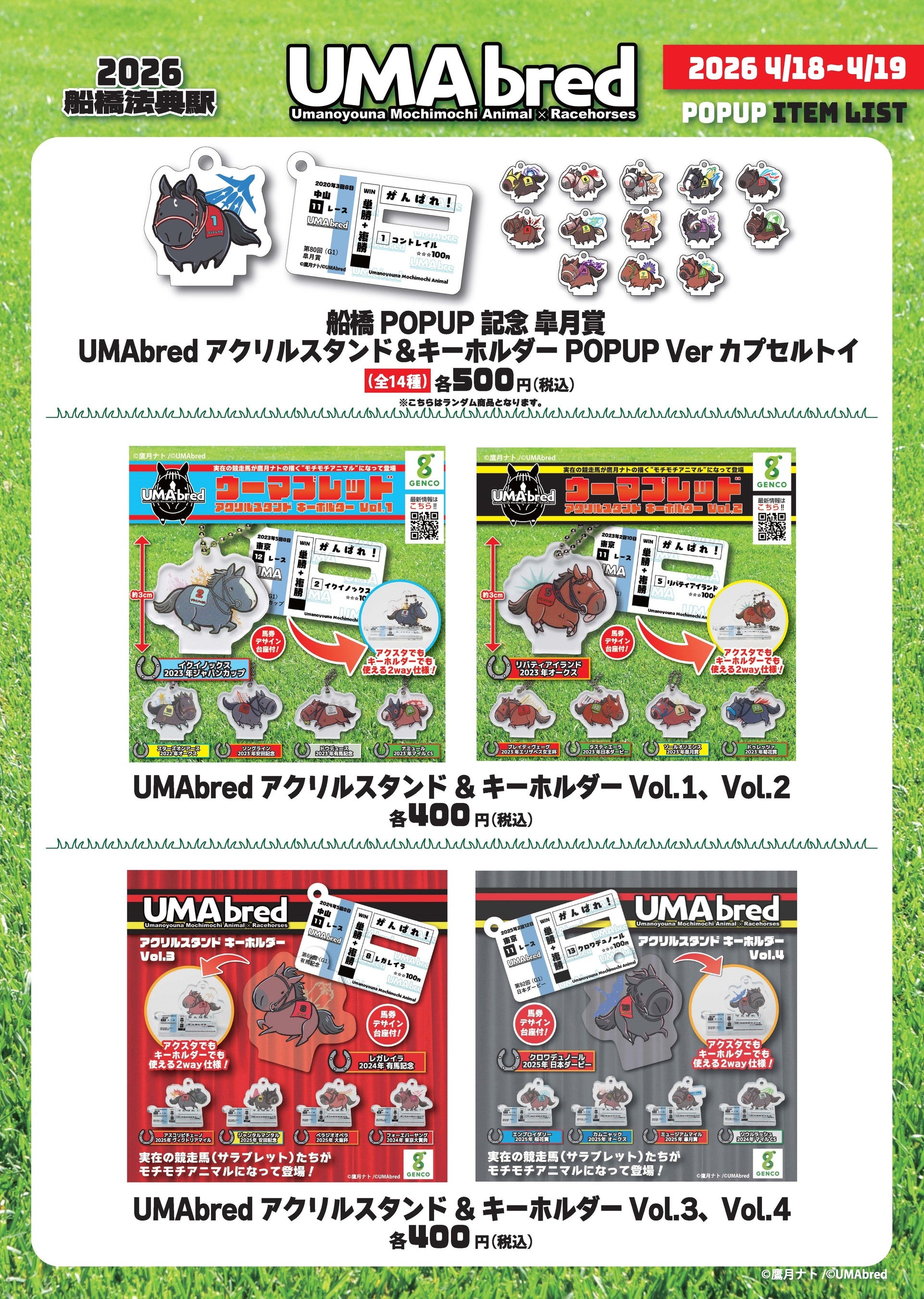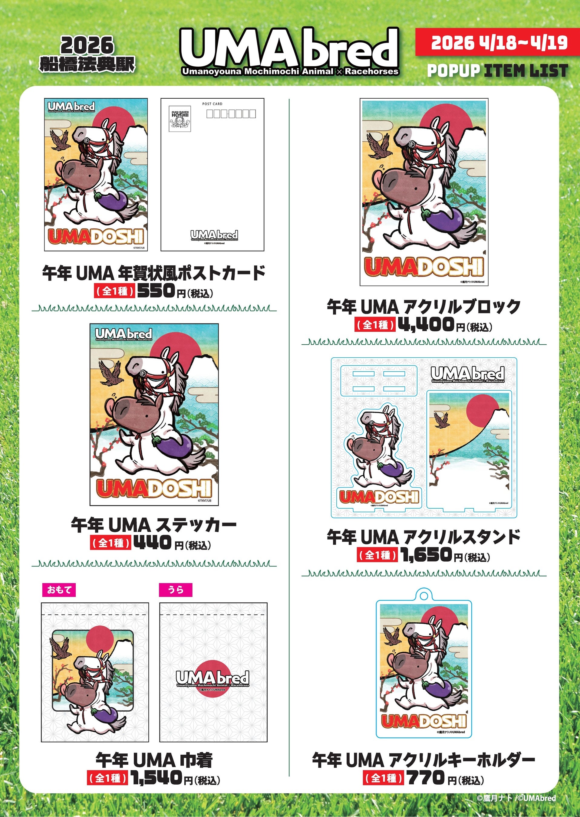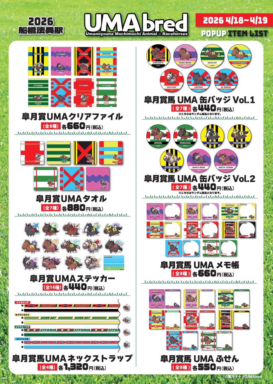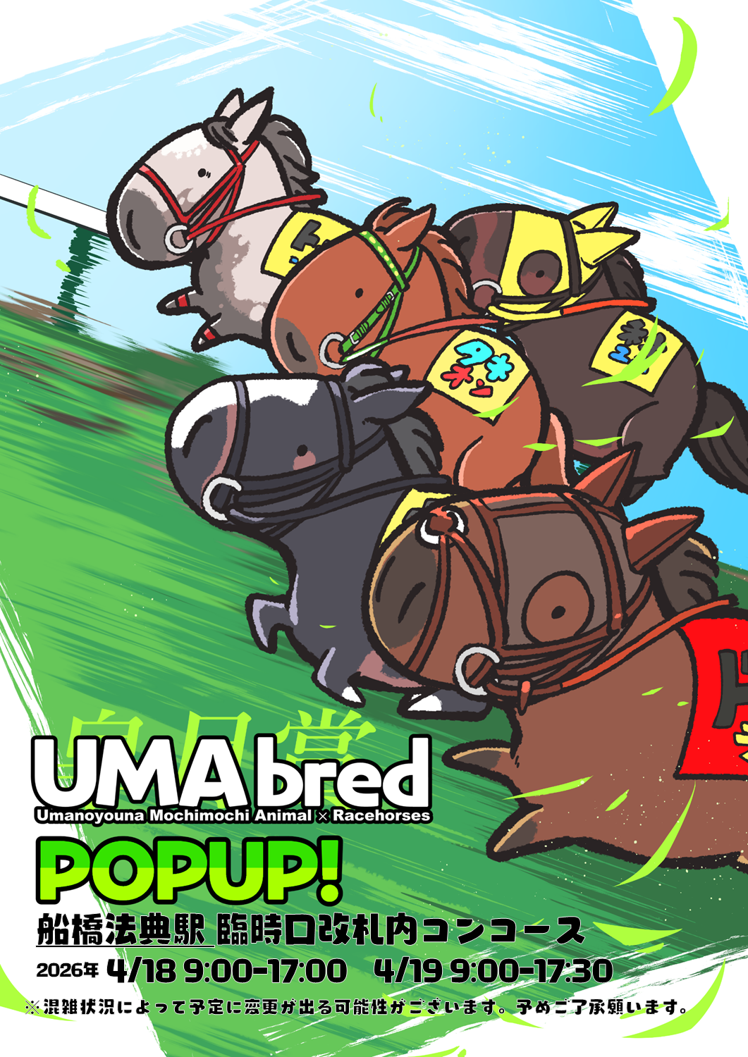 実在の競走馬・引退馬を「UMA」(ウマのようなモチモチアニマル)として描きおろすグッズブランド「UMAbred」は4/18(土)・4/19(日)限定でJR船橋法典駅にて皐月賞出張POPUPを実施いたします。
