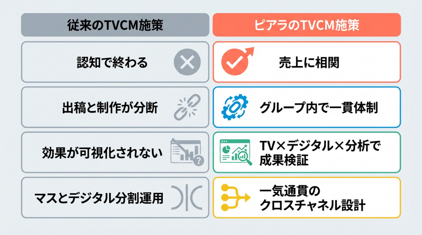 認知からユーザー獲得、ファン化までフルファネルでダイレクトマーケティングを行う株式会社ピアラ(本社:東京都渋谷区、代表:飛鳥貴雄、以下「当社」)は、TVCMに「誰に・どれだけ・どう届き、その後どう動いたか」までを担保する成果連動型TVCM支援サービスの提供を開始しました。デジタル広告で培った成果保証モデルをTVCMへ拡張し、インプレッション数を保証し、視聴後の行動データまで可視化することで、TVCMを「出す広告」から「当てる広告」へ変革します。
