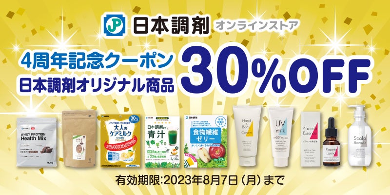 日頃のご愛顧に感謝をいたしまして、本日から4周年記念キャンペーンを開催いたします。本キャンペーンでは、健康食品やコスメなどの日本調剤オリジナル商品を30%OFFでご購入いただけます。