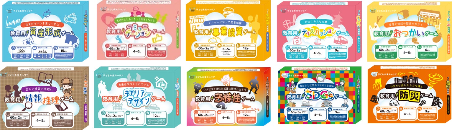 「子ども未来キャリア」は、子どものときから夢や目標を持ち、グローバル社会で必要となる知識と能力を育む、キャリア教育用ボードゲーム教材です。ボードゲームを通じた疑似体験と、スライド教材を活用した学習を組み合わせた「遊び×学び」を融合した内容で、主体的に楽しく学ぶことができます。