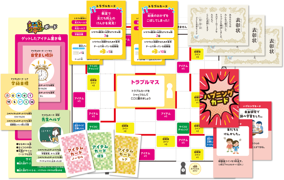 協力し合いながらトラブルを解決して、チームでなるべく多くの表彰カードを集めるゲームです。トラブルを解決するために、様々なアイテムや経験値を集めていきます、アイテムは3種類あり、経験値コインと交換できるものや役割によって交換できるものなどがあります。どのマスに進めばよいかはチームで話し合ったり、チームのために自分にしか得られないアイテムをゲットしたりと、チームワークを育みながらゲームを進めていきます。