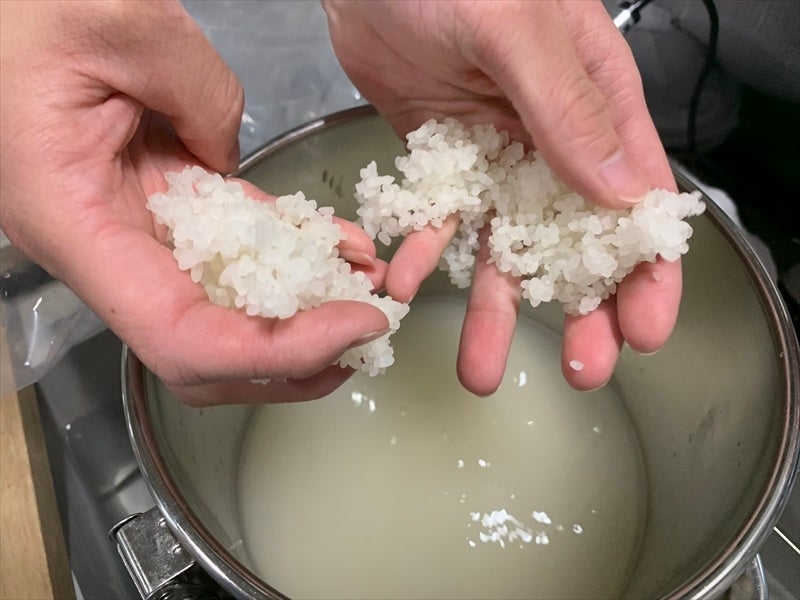 天空農園で収穫した玄米を精米歩合50%まで磨いた後、いよいよ酒造りが始まります。神戸にある当社の蔵で、わずか15キロほどしかない貴重な白米を、一粒も無駄にしないように細心の注意を払いながら、すべて手作業で仕込みます。100Lタンクという小さなタンクで約2ヵ月かけ大切に醸しました。