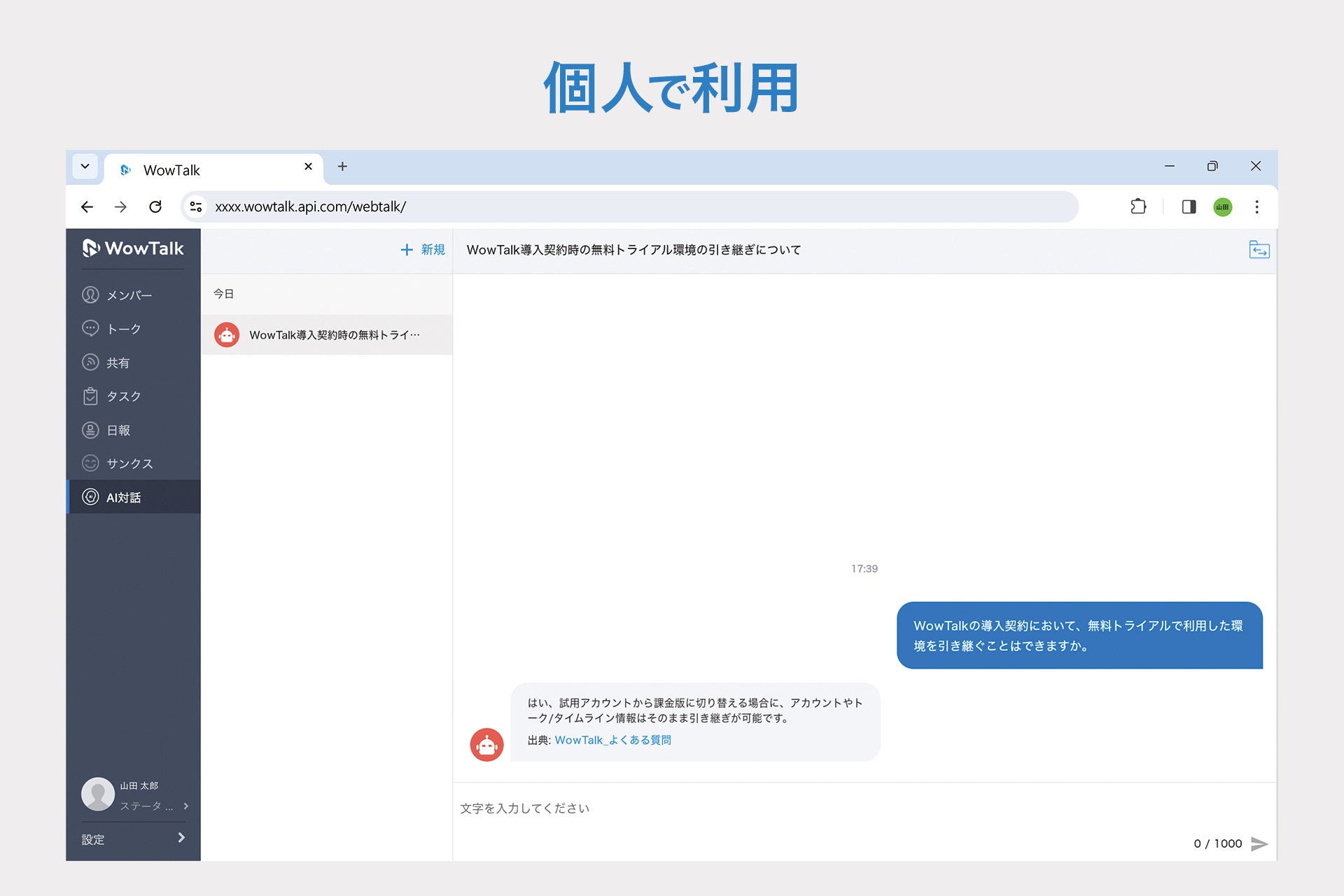WowTalkをご利用されている方は、「フリー」でWowTalk AIが無料で使えます。
