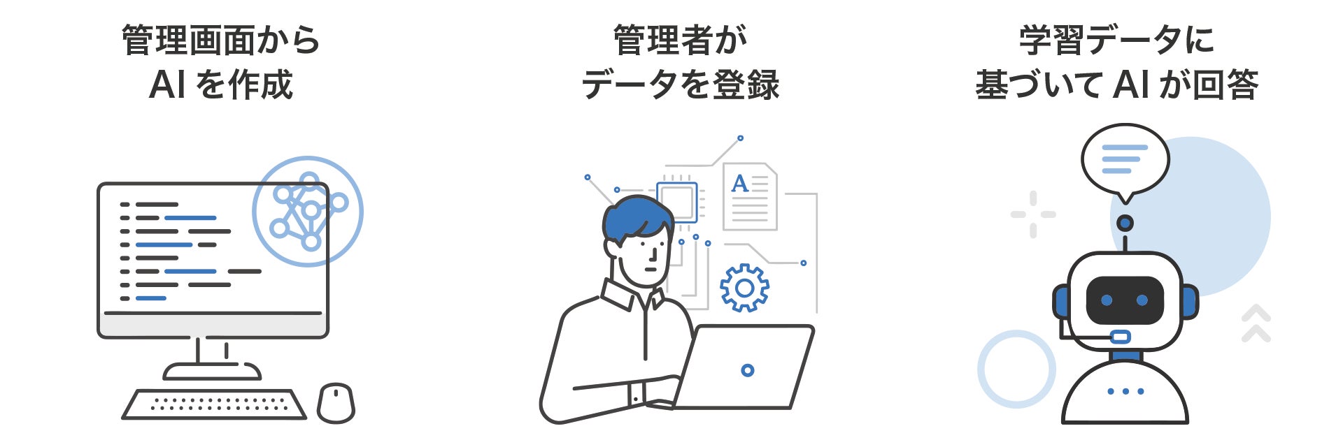 ユーザー自身がカスタマイズできる、自分専用のAIチャットサービスです。学習させたいデータ(20個)をAIに登録でき、データに基づいてユーザーからの質問に回答します。