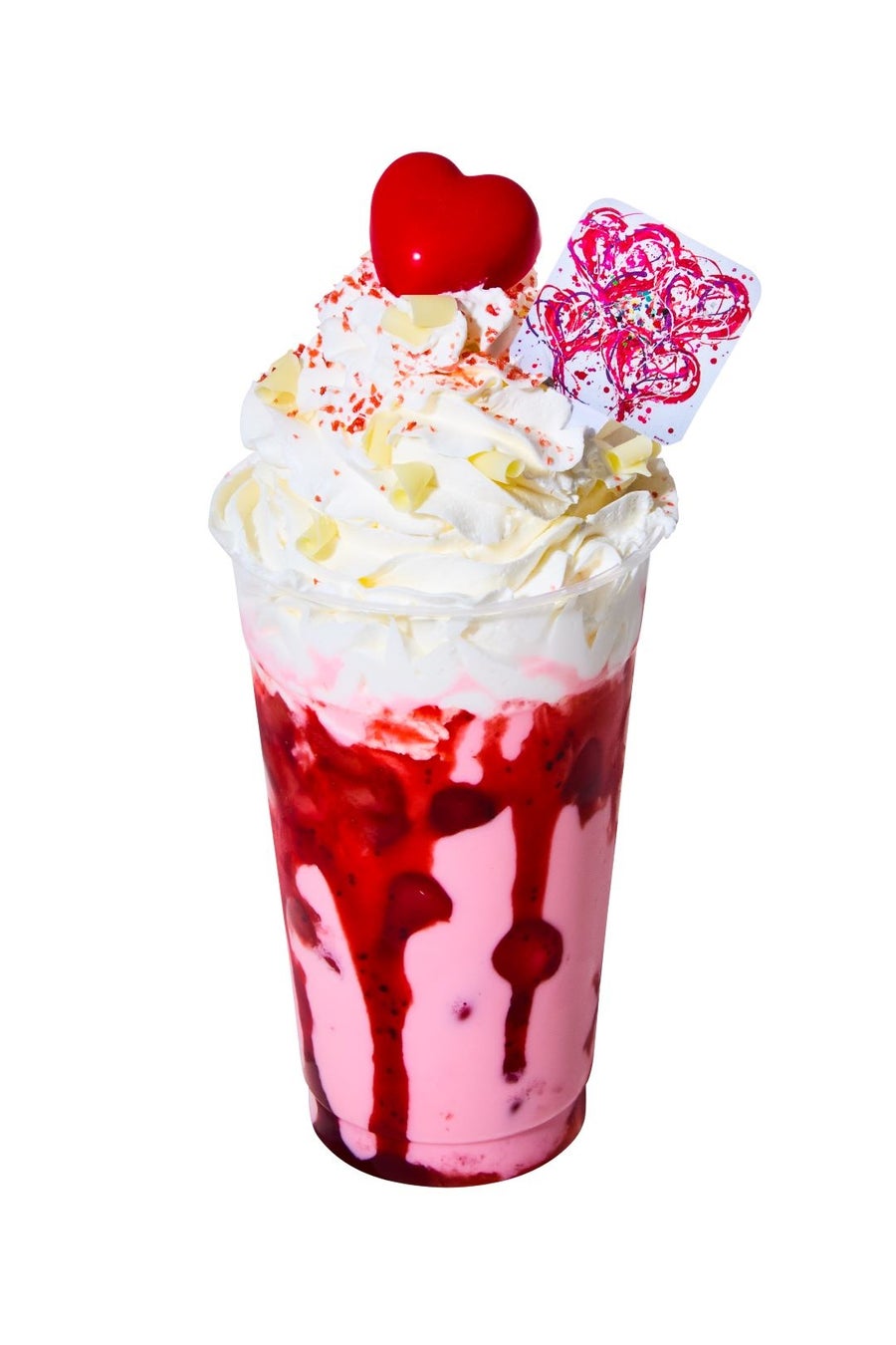 白いキャンバスに見立てたソフトクリームに大きな赤いハートのチョコをトッピングしたつぶつぶ果肉入りのいちごみるく。ハートのまわりには、ストロベリー顆粒とカールしたホワイトチョコを散りばめて作品の躍動感を表現しました。
