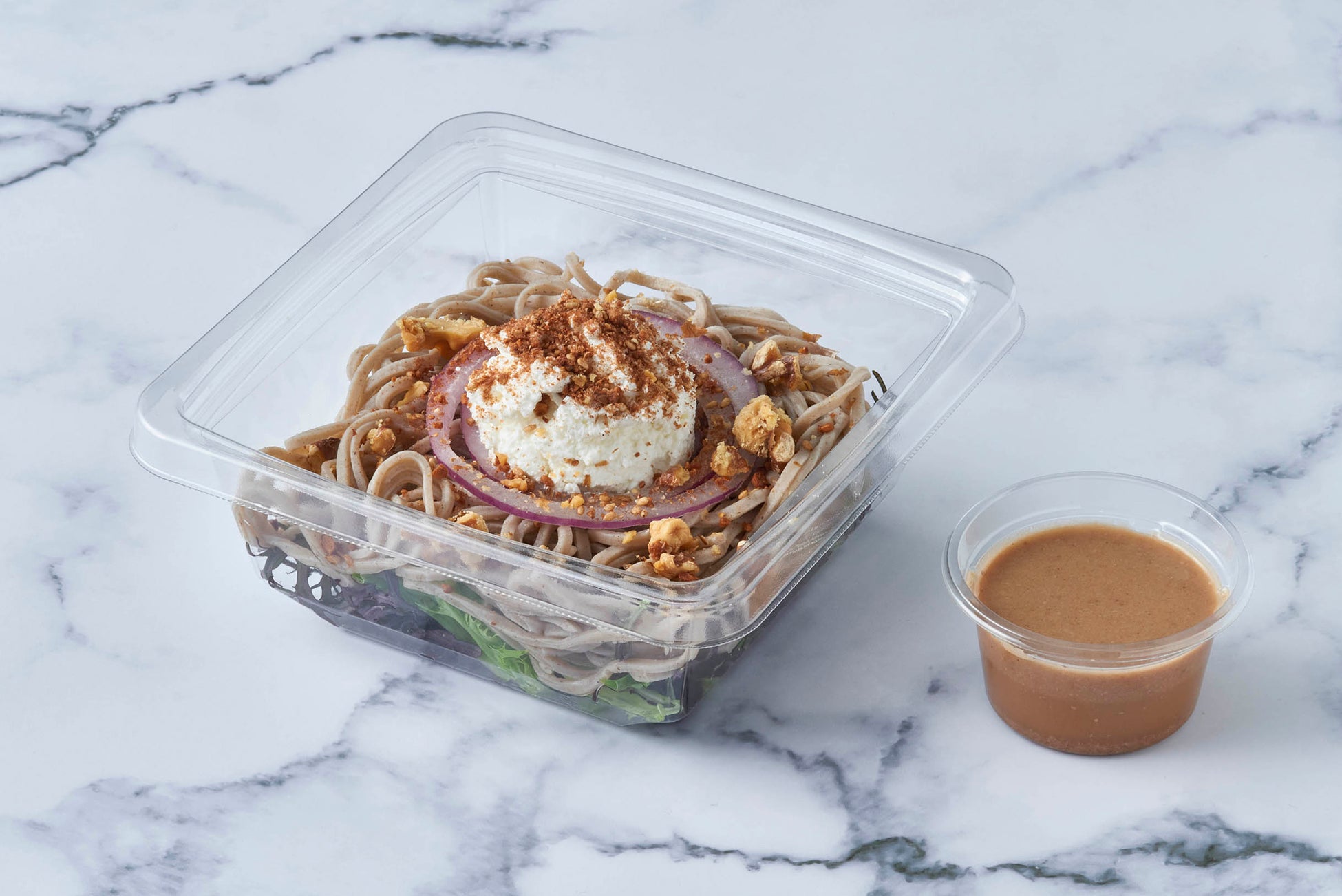 福井県のお蕎麦屋さんを巡り、くるみ蕎麦のアイデアを活かしたメニューを考案。そばと一緒に野菜やカッテージチーズもたっぷり添えました。くるみつゆをよく絡めてお召し上がりください。(銀座店のみ取扱がございません)
