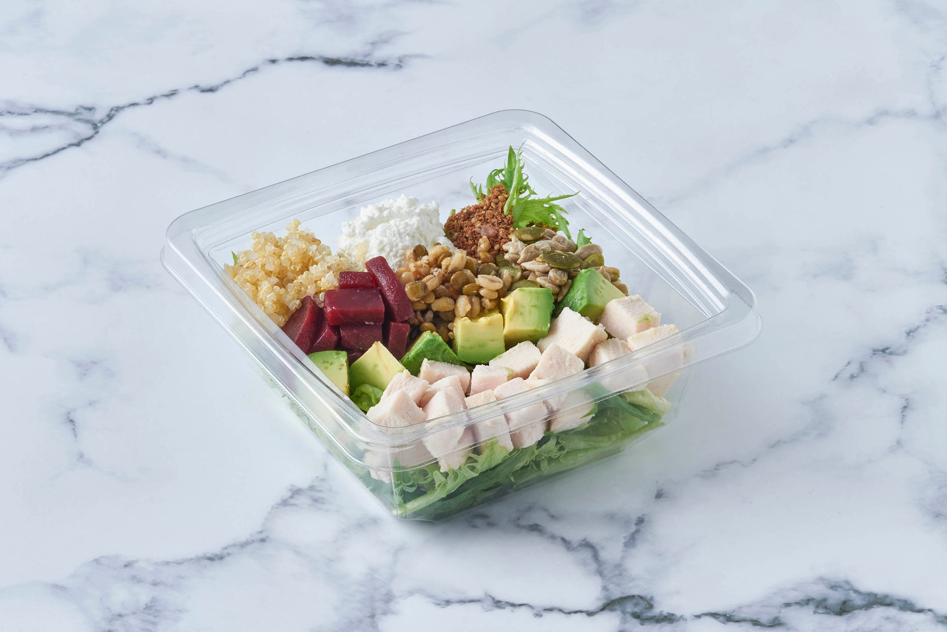 栄養バランスを考えて作られた、食べ応えのあるサラダです。アボカド・キヌア・ビーツなど15品目以上の食材を使用しています。カカオバター・スパイス・ナッツをミックスしたオリジナルのパウダードレッシングと一緒によく混ぜてお召しあがりください。(銀座店のみ取扱がございません)