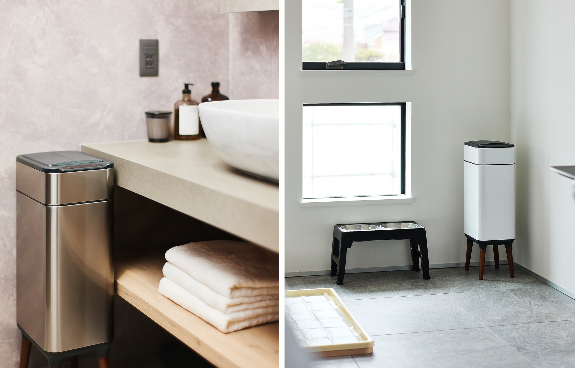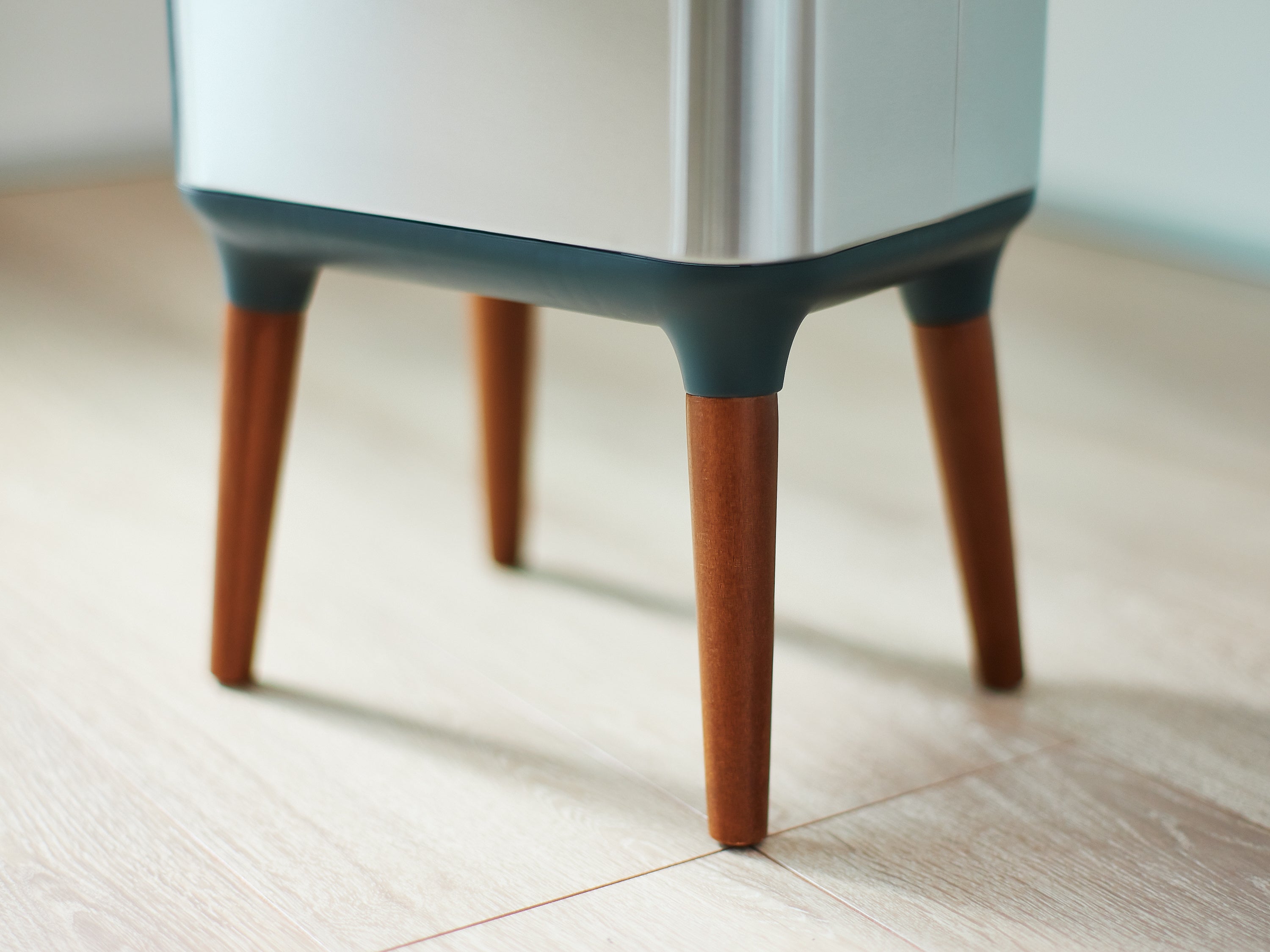インテリアに馴染むミニマルなデザインで、カラーはシルバーとホワイトの2色から選べます。木製の脚を含むデザイン全体にこだわった「NONN」は、いかにも“ゴミ箱"という存在感や圧迫感を和らげます。「NONN」の上蓋は観音開き式で本体の内側に収納されるので、上部に余分なスペースを必要としません。また、IPX防水機能つきなのでキッチン、リビング、寝室だけでなく、湿度高い洗面所など、お好きな部屋に設置可能です。一番置きたいキッチン内の狭い場所に置けない、というジレンマからも解放されます。