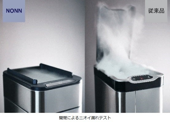 蓋が上開きのゴミ箱は、開閉の度にニオイが広がりやすいという悩みがあります。収納式観音開きの「NONN」は、空気の動きをできるだけ最小限に抑えることで、ニオイが広がりづらく、周囲にニオイを撒き散らしません。また、開閉のスピードにも着目。スピードが速すぎると動作音が大きくなるだけではなく、ニオイをまき散らすので、空気の動きを抑え、待ち時間が無くストレスのない絶妙な速さに。さらに、フタと本体の左右の接触部分が凹凸形状に嚙み合わさるように工夫し、結合部のスキマから臭いが漏れにくい設計を採用しました。