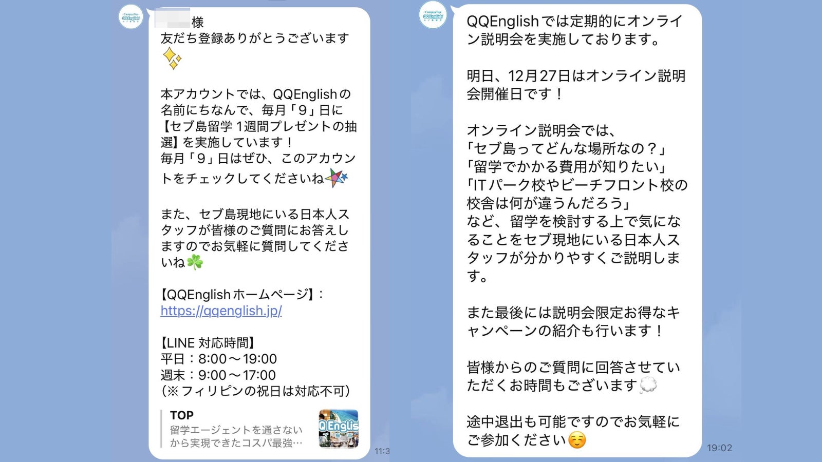 QQEnglishの公式LINEでは、セブ島留学を検討中の方に向けた最新情報をリアルタイムで配信しています。リニューアルに伴い、使いやすさと充実したコンテンツで、セブ島留学を検討している方に最適な情報をご提供します。