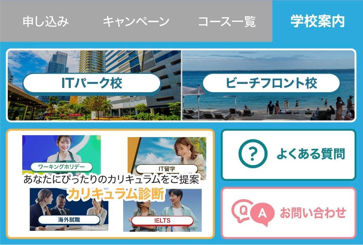 ITパーク校とビーチフロント校、それぞれの校舎の特徴や雰囲気を写真や動画で確認できます。 -