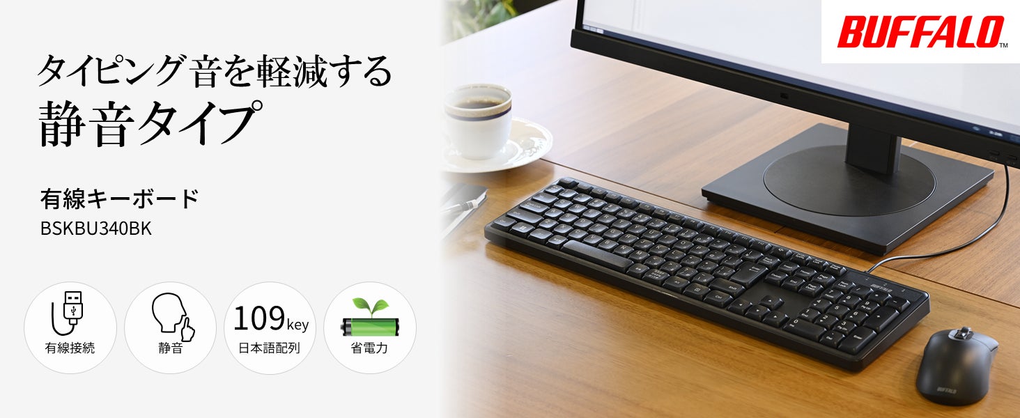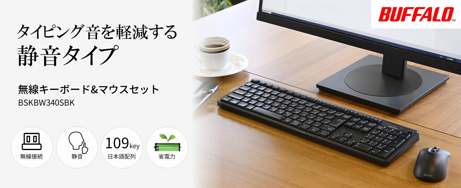 株式会社バッファロー(本社:東京都千代田区、代表取締役 社長執行役員CEO:牧 寛之)は、2.4GHz無線接続モデルのキーボードとマウスのセット「BSKBW340SBK」と、有線接続モデルのキーボード「BSKBU340BK」を2025年5月上旬より順次出荷、販売いたします。