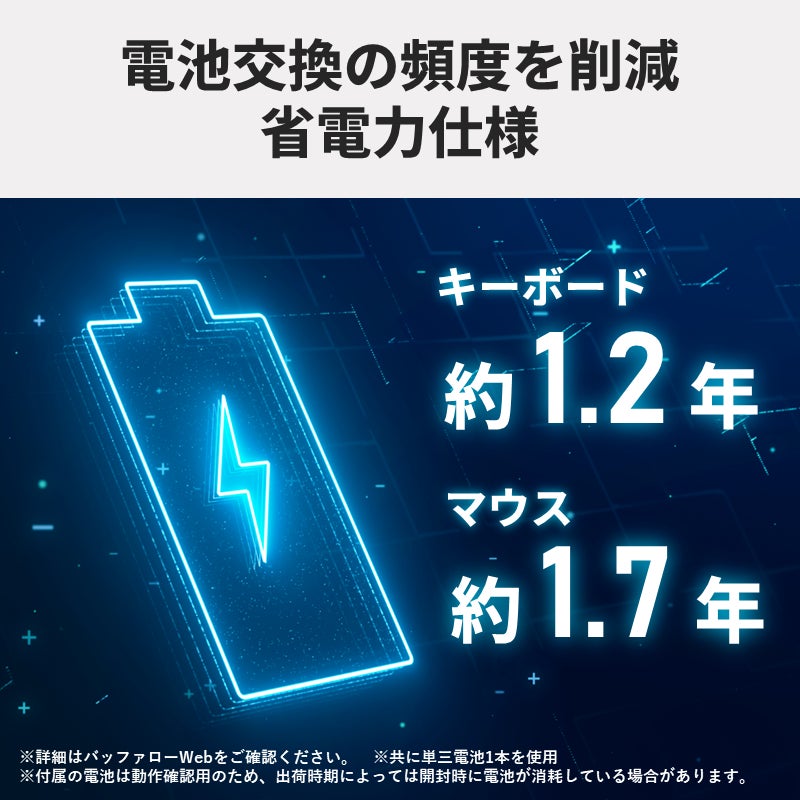 付属のレシーバー1つでキーボードとマウスともにかんたんに接続できます。単3電池1本で約1.2年動作する省電力設計(※)です。