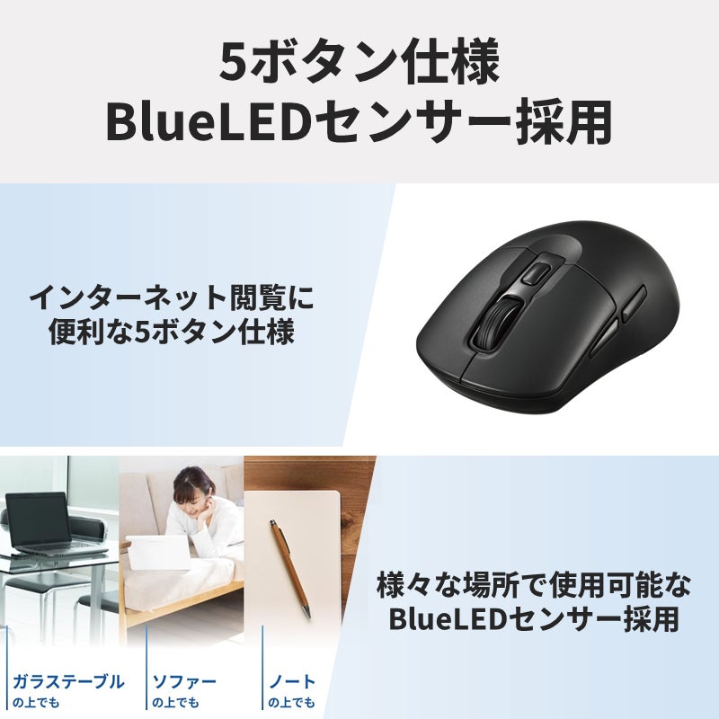 マウスもキーボードと同様に静かな場所でも気にならない静音設計です。また高感度BlueLEDを搭載しておりスムーズな操作が可能です。