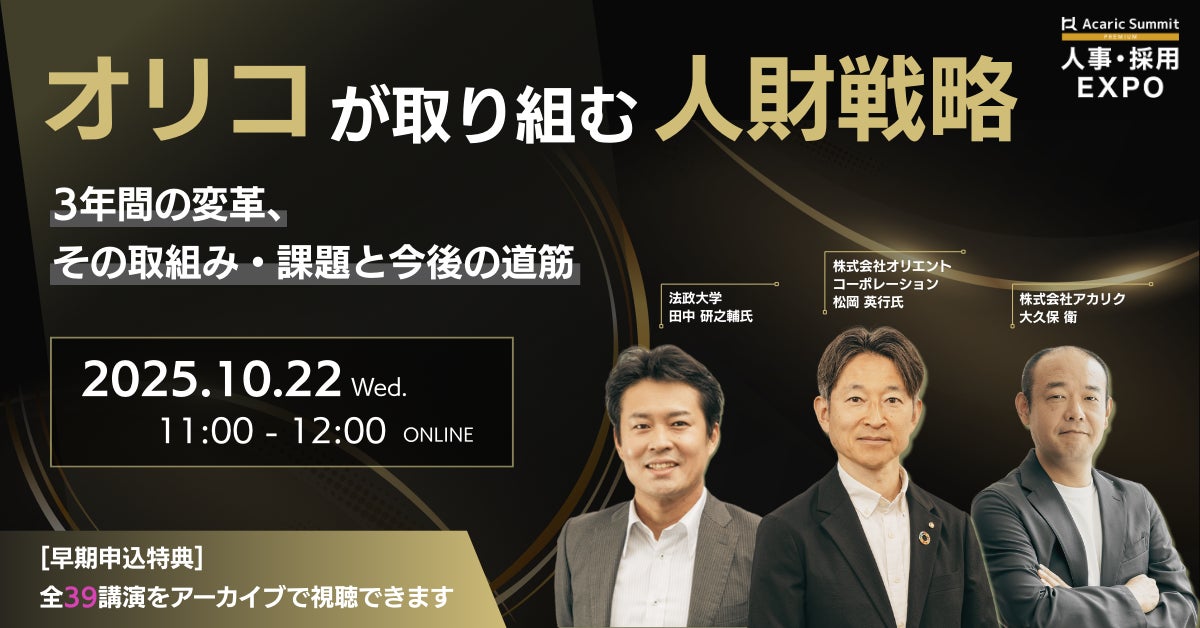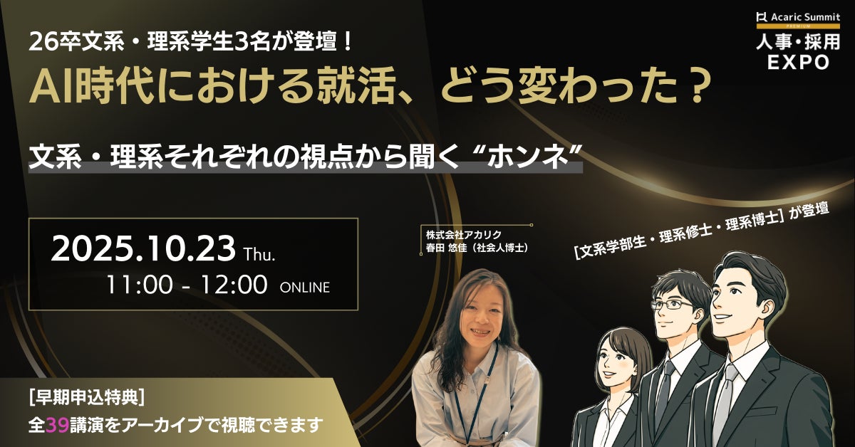 博士人材をはじめとする大学院生・研究者のキャリア支援を行う株式会社アカリク(本社:東京都渋谷区、代表取締役:山田 諒、以下 アカリク)は、国内最大級のHRオンラインイベント「Acaric Summit Premium 人事・採用EXPO -2025 -Autumn」を2025年10月22日(水)・10月23日(木)・10月24日(金)に開催いたしました。