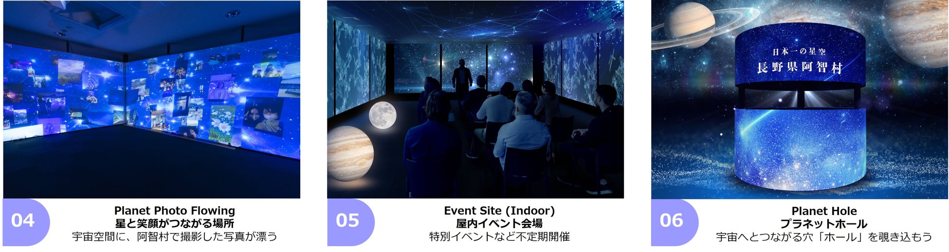 星空をテーマとした映像や光の演出が皆様をお迎えするEntrance Zone(エントランスゾーン)、ガイドによる星空解説や、森を歩きながら新たな発見をするExperience Zone(体験ゾーン)、静かに星空を眺めるSilent Zone(静寂ゾーン)があり、場内を巡り星空のエンターテインメントパークをお楽しみいただけます。