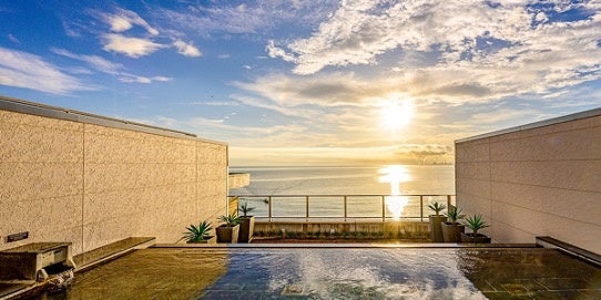 遮るものなく広がる別府湾を一望する温泉大浴場。特に露天風呂は海から吹く風を感じながら、朝は水平線から昇る朝日、日中は青い海を、夜は遠くに大分市内の夜景を眺めるご入浴をお楽しみいただけます。