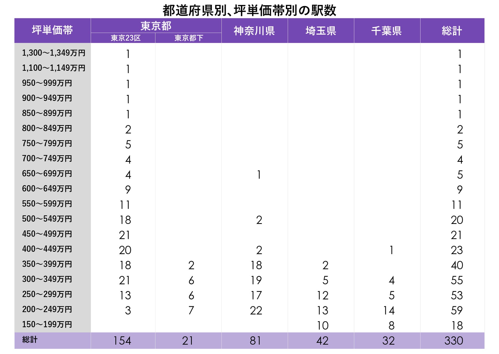 首都圏1都3県で最も坪単価が安かった千葉県の成田駅でも坪単価153万円(1㎡あたり49万円)で、相場の上昇に伴い下限の相場も底上げされていることが分かります。