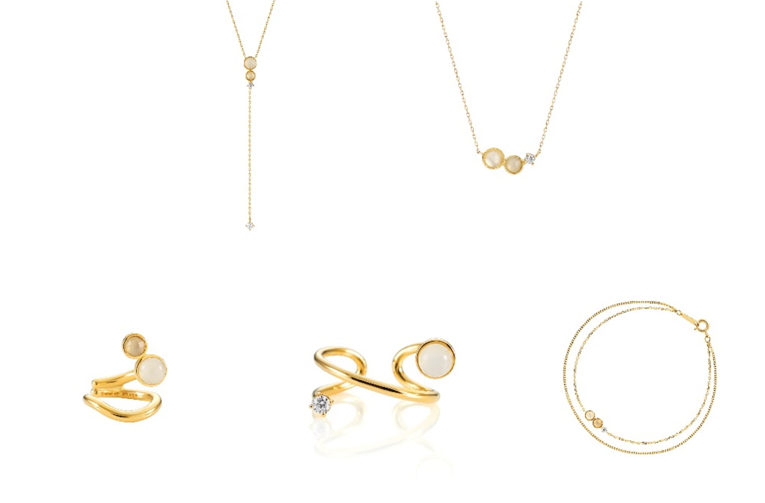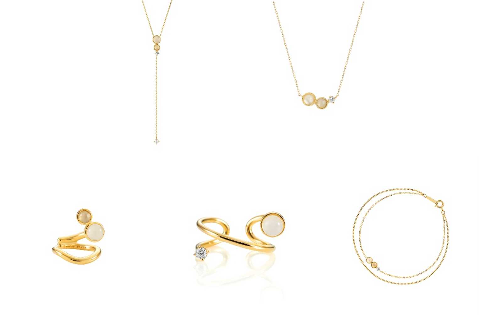 光にインスパイアされたシリーズは、ドーム型の表面が愛らしいカボションカットのムーンストーンに、ストーンの輝きを引き出すチェッカーカットのキュービックジルコニアを配しました。アシンメトリーのリングやイヤーカフは、穏やかながら力強い光の表情を繊細に映しています。チェーンとストーンのコンビネーションが魅力のネックレスやブレスレットも、身に着ける人の素肌に上品ながら鮮やかな彩りをプラスします。