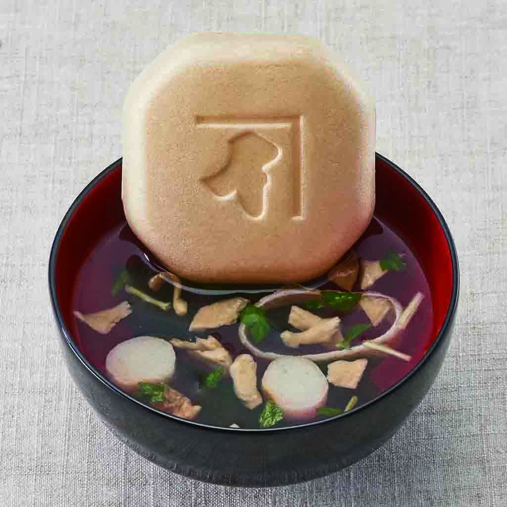 「至福の一椀 お吸物もなか」は、茶色の皮に「つゆの素ゴールド」を、白とピンクの皮に「白だしゴールド」を練り込んでおり、もなかの皮も美味しく召し上がれる逸品です。もなかの中には、顆粒だしの「本枯鰹節 金色の鰹だし」を使用しており、厳選された本枯鰹節、しいたけ、昆布の上品な味わいをお楽しみいただけます。