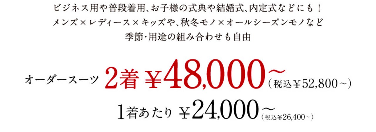秋冬モノ新作×オールシーズンモノ×ビジネス×礼服、メンズ、レディースなど、お好きな組み合わせでオーダーが可能です。また、お知り合いやご家族と1着ずつのオーダーでもフェア適用となります。