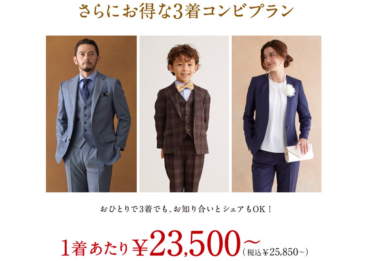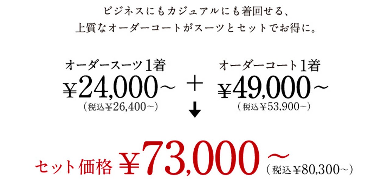 ※コンビプランとは・・・オーダースーツ2着以上ご購入していただいた場合の1着あたりのお値段です。組み合わせは自由ですので、異なる価格帯のオーダースーツと組み合わせていただいても本価格が適用されます。