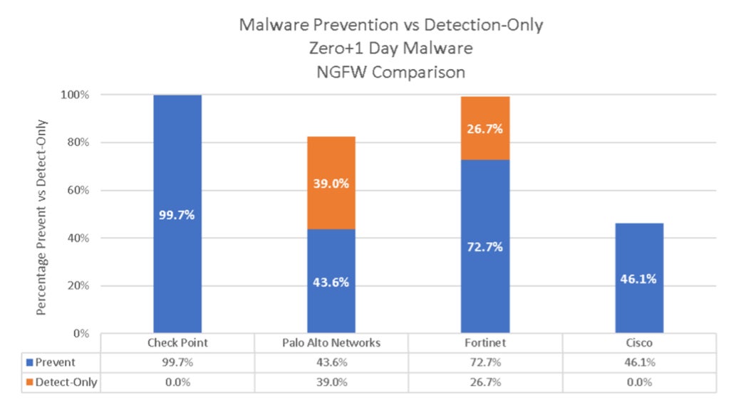 Miercomは、アナリストのレポートと異なり、テストラボによる広範な評価を提供しています。2023年初頭、チェック・ポイントは第三者機関による客観的なセキュリティ有効性テストの競合ソリューション3社との比較で最高点を獲得しました。以下はテスト結果の1つです。グラフと評価に関する詳しい説明は、Miercomのレポートをダウンロードしてご覧ください。