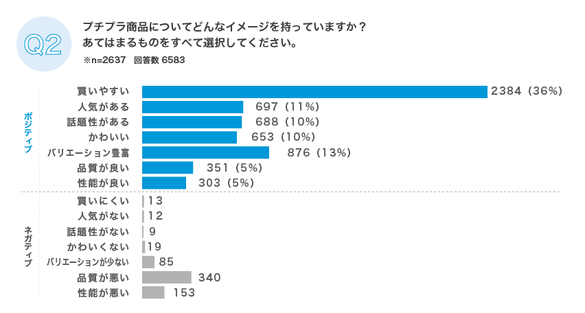 【Q2】「プチプラ商品についてどんなイメージを持っていますか?」に対する回答としては以下のようになりました。(n=2637)