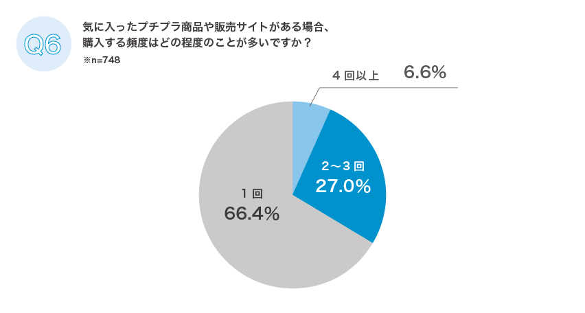 【Q6】「気に入ったプチプラ商品や販売サイトがある場合、購入する頻度はどの程度のことが多いですか?」という問いに対して、月に2回以上購入すると答えられた方が1/3程度おり、1カ月に複数回購入する方が一定数存在することがわかりました。(n=748)