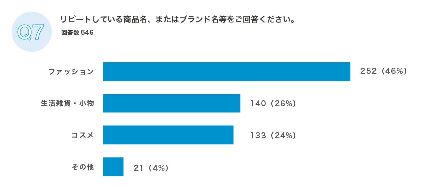 【Q7】上記Q5でリピートしているお店や商品があると回答された方に「リピートしている商品名、またはブランド名等をご回答ください。」とお聞きしたところ以下の回答結果になりました。(n=748)