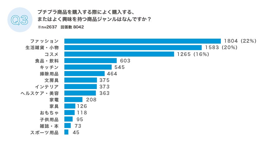 【Q3】「プチプラ商品を購入する際によく購入する、またはよく興味を持つ商品ジャンルはなんですか?」に対する回答としては以下のようになりました。(n=2637)