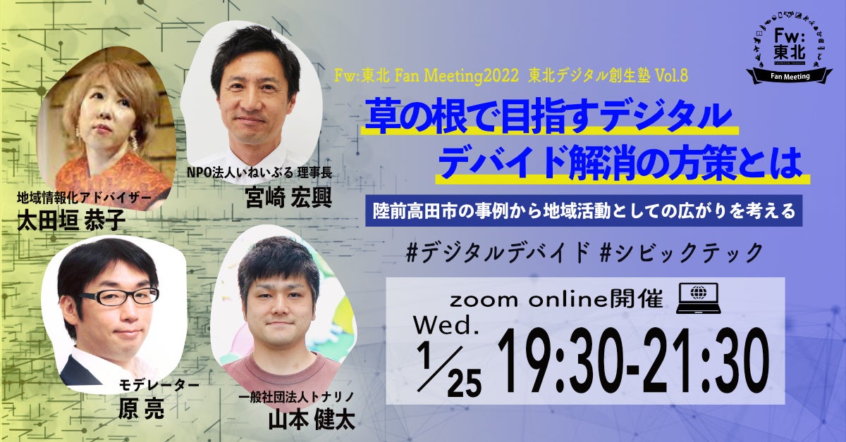 エイチタス株式会社(本社:東京都品川区、代表取締役:原 亮/小澤 剛)は、復興庁主催のワークショップ「Fw:東北(フォワードとうほく)Fan Meeting」にて、「東北デジタル創生塾Vol.8 草の根で目指すデジタルデバイド解消の方策とは~陸前高田市の事例から地域活動としての広がりを考える」の企画運営を行い、1月25日夜に無料のZoomミーティングを開催します。