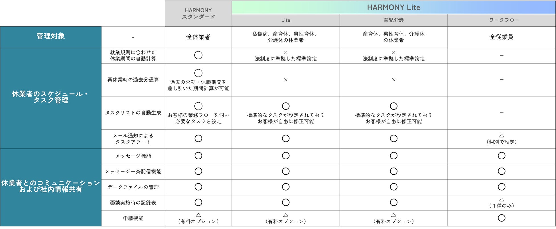 昨今、休業者の増加に伴いメンタルヘルス不調や育児・介護による休業者とのコミュニケーション、スケジュールや書類の授受等、各種管理おけるご担当者のお悩みを聞く機会が増えています。さらに、2025年4月および10月に控えている改正育児・介護休業法による休業者管理へのニーズが企業の規模を問わず高まることを見据え、これまでのノウハウを活かしつつ、機能を厳選し利用価格を抑えた「ADVANTAGE HARMONY Lite(アドバンテッジ ハーモニー ライト)」として3つのプランをラインアップしました。