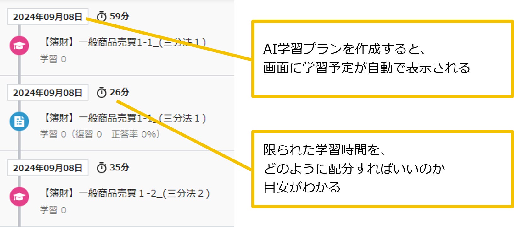 AIが受講者の学習可能時間や現在の実力を分析し、試験日までに最も得点を伸ばせる学習計画を作成します。「今日、何をどこまでやればいいか」が明確に提示されるため、学習の順番やペースに迷うことがありません。また、進捗状況を自動的に記録し、学習プランと実際の学習履歴を比較することで、計画と行動のズレを修正しながら学習を進めることができます。