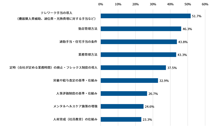 1位は「テレワーク手当の導入(機器購入費補助、通信費・光熱費増に対する手当など)」51.7%となりました。交通費やオフィスの光熱費等の経費が削減できた分、テレワークで発生する費用に対し手当を求める方が過半数となりました。2位「勤怠管理方法」46.3%、3位「通勤手当・住宅手当の条件」43.8%、4位「業務管理方法」43.3%、5位「定時(会社が定める業務時間)の廃止・フレックス制度の導入」37.5%と続いています。
