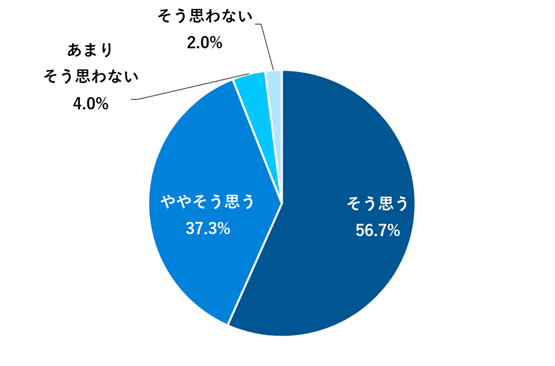 現在勤務先でテレワークが認められており週3日以上テレワークしている方に、テレワークでの業務の仕方に慣れて(馴染んで)いるか聞いたところ、「そう思う」56.7%、「ややそう思う」37.3%と、テレワークに慣れた方が94.0%にのぼることがわかりました。2020年に緊急事態宣言解除後もテレワークを行っていた人にとってはテレワークでの業務スタイルが個人レベルでは定着したと言えるのかもしれません。