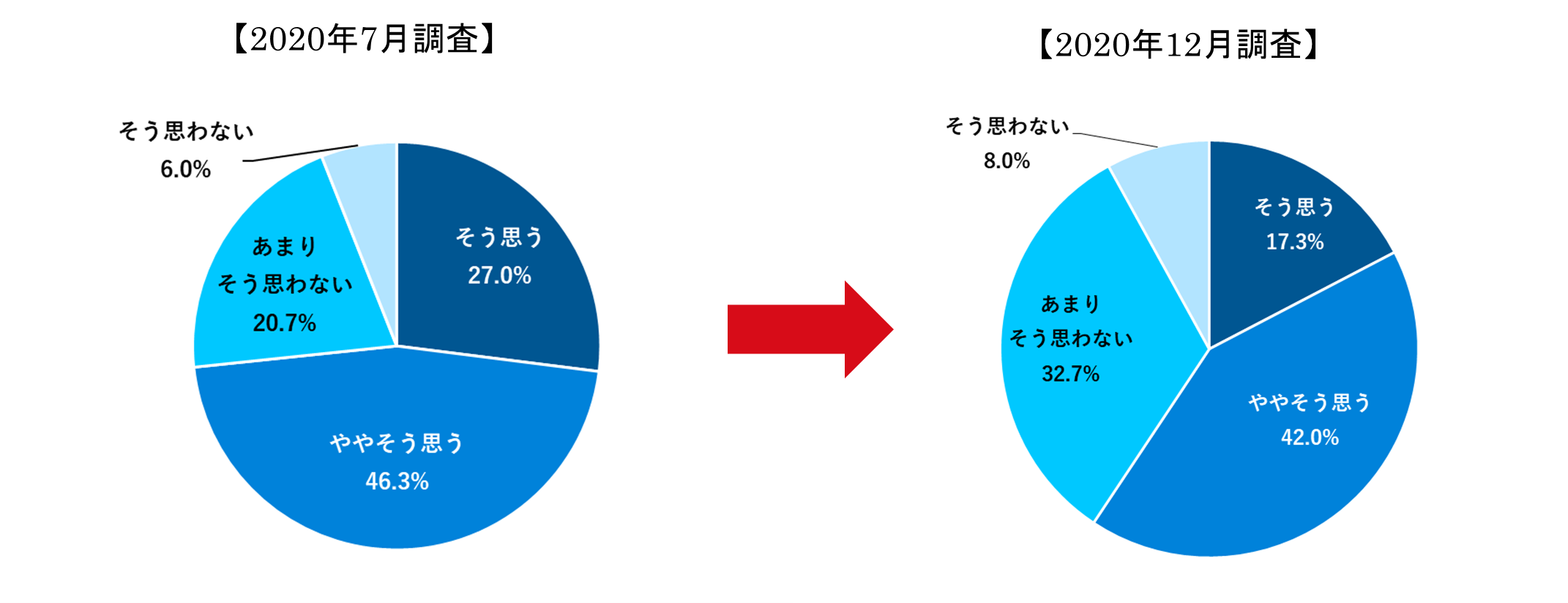 2020年7月にあしたのチームが行った調査(「Withコロナの働き方と人事評価に関する調査」:https://www.ashita-team.com/news/20200721-2/)では「“Withコロナ”の世の中では新型コロナウイルス流行前と比べて一般的にテレワークが定着すると思うか」に対し、「あまりそう思わない」20.7%、「そう思わない」6.0%と【そう思わない】の計が26.7%でした。約半年で、テレワークが定着しないと思う方の割合が14ポイント増えたことが明らかになりました。