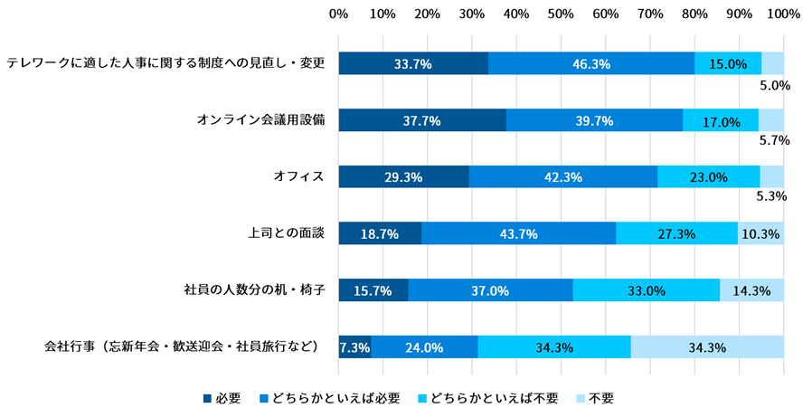 必要:1位「テレワークに適した人事に関する制度への見直し・変更」80.0%、2位「オンライン会議用設備」77.4%、不要:1位「会社行事(忘新年会・歓送迎会・社員旅行)」68.6%、2位「人数分の机・椅子」47.3%