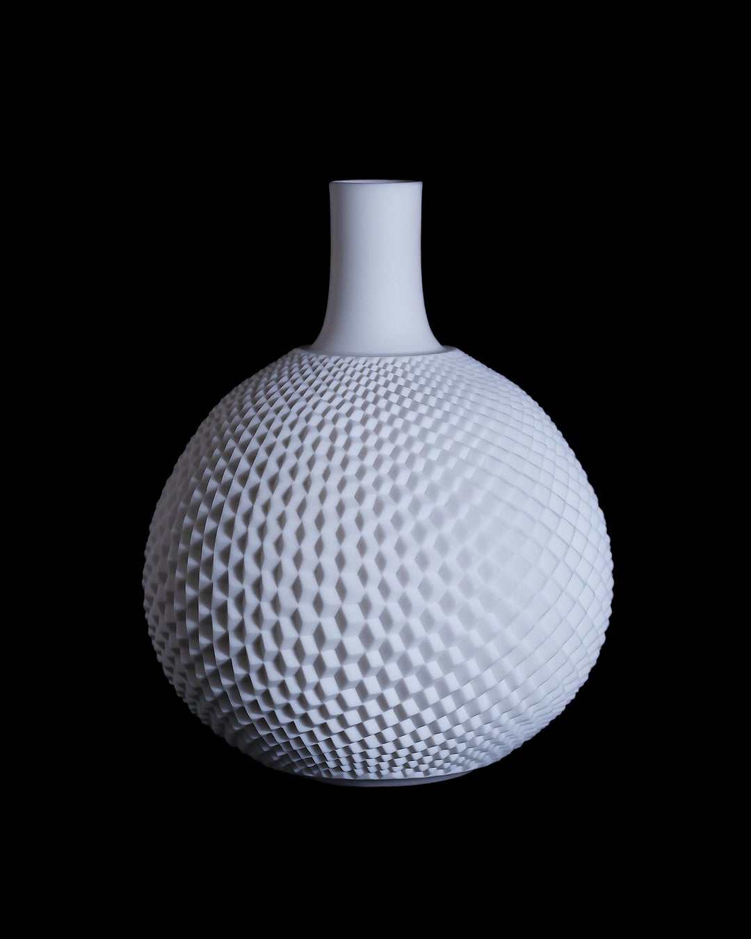 南 繁樹氏は、美しい白磁のボディーに大胆な彫りや緻密な幾何学模様の彫りを加えた、静謐な中にも饒舌な世界を展開しています。