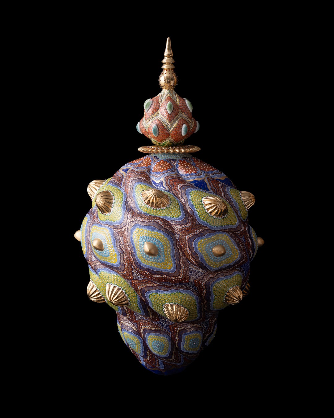 鈴木秀昭氏は、絢爛豪華な色絵金彩の技を駆使し、目くるめく幻惑の「器物の中の小宇宙」を創作しています。