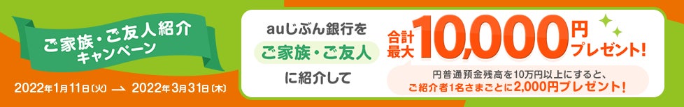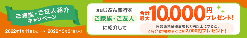 auじぶん銀行を紹介すると最大1万円がもらえる「ご家族・ご友人紹介キャンペーン」実施