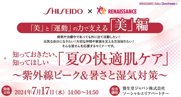 株式会社ルネサンス(本社:東京都墨田区、代表取締役社長執行役員:岡本 利治、以下「当社」)は、この度、当社が取り組む「がん患者のQOLを高めるためのがん患者支援」の一環として、資生堂ジャパン株式会社(以下「資生堂」)が実施する「資生堂ライフクオリティー ビューティー活動」と連携し、紫外線ケアに関する「夏の快適肌ケアセミナー」を共催します。