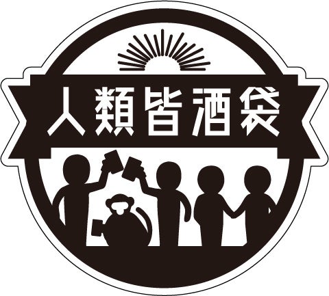 人々が手を繋ぐことで人々の繋がりも込めて、お酒を高く上げることで楽しさを表現し『悩まなくて良い』というメッセージをこめています。ここでいう人類という言葉は広く捉え、動物の猿も入れ、デザインしました。
