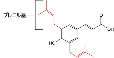 ※1 アルテピリンC・・・桂皮酸誘導体(※2)の一種で、BGPに特長的な成分。p-クマル酸にプレニル基(下図、赤)が2つついた構造をもつ。
