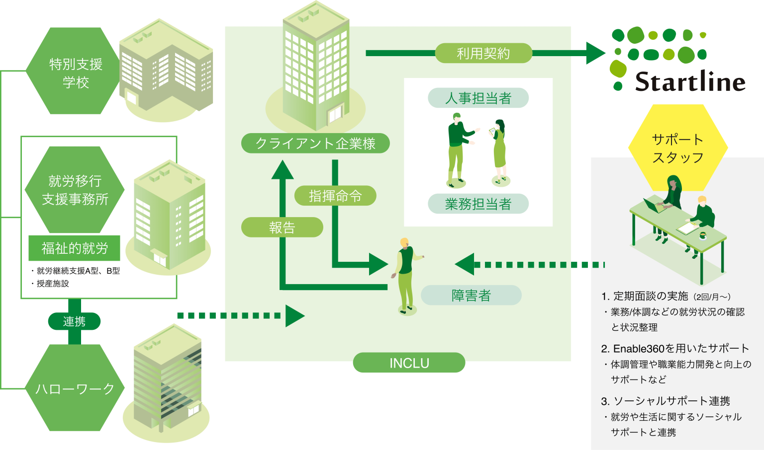 INCLUは、職域開拓や採用、適性判断やチームビルディング、定着や能力開発に関する相談までトータルで支援します。