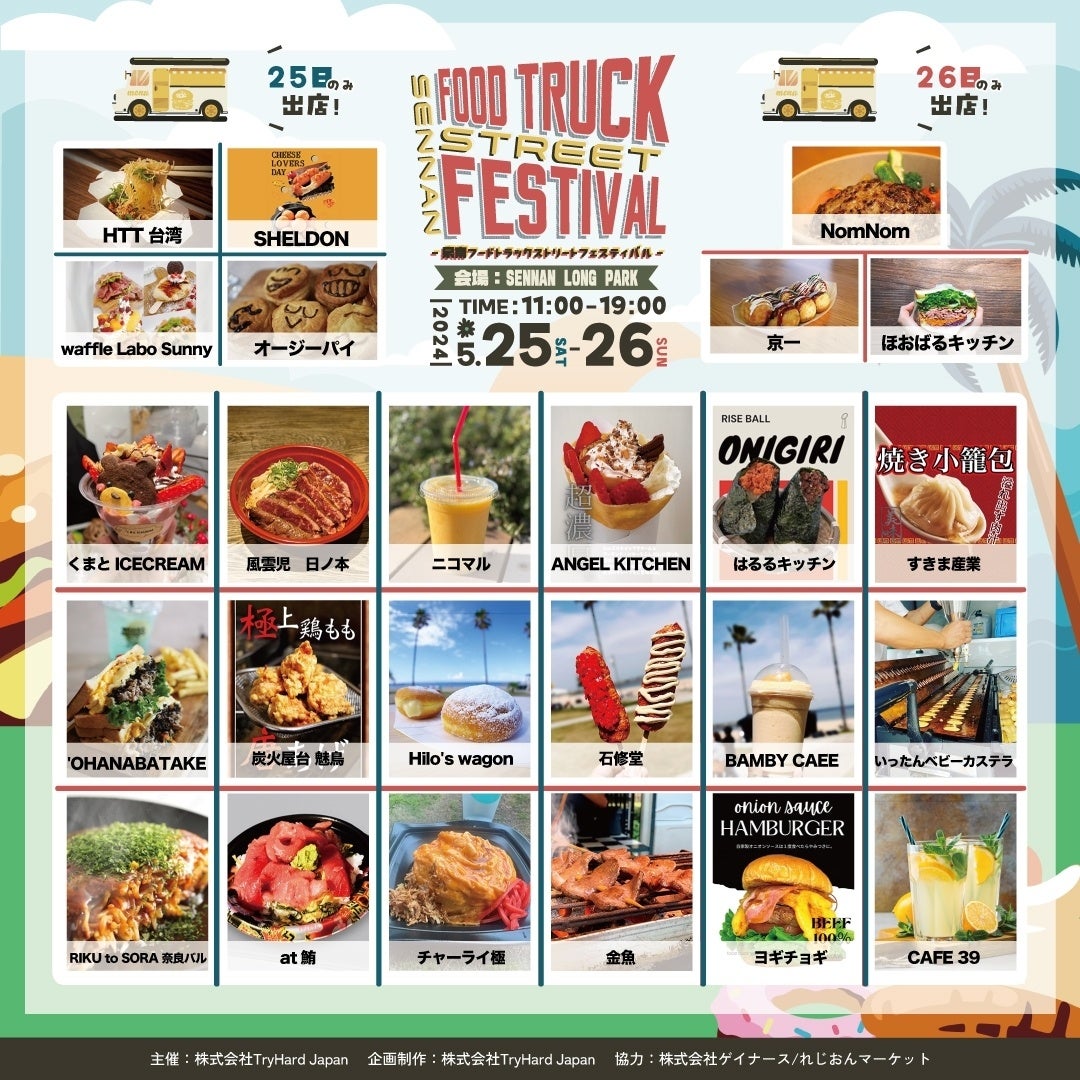 株式会社TryHard Japan(所在地:大阪市中央区)は、2024年5月25日(土)、26日(日)の2日間、SENNAN LONG PARK(センナンロングパーク)にて、グルメフェス「FOOD TRUCK STREET FESTIVAL vol.5」を開催いたします。